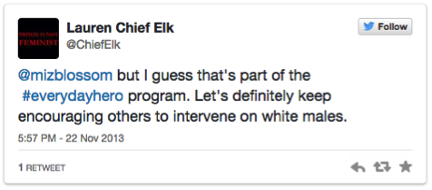 The problems with bystander intervention go beyond a simple failure to reframe, due to layers of privilege involved. Lauren Chief Elk shared some deeper analysis on Twitter a year ago (and many times since then), including her personal experience intervening as a bystander: